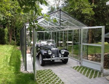Hier wurde aus einem Plantina Gewächshaus eine Garage für einen Oldtimer. Durch die transparente Verglasung kann der schöne Oldie auch bei Regen bestaunt werden.